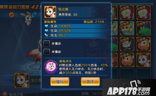 精灵技能萌兔冲击:对附近敌人造成250%伤害,10%使其进入无力状态,无力状态时,减少300点攻击,持续5秒(持续时间由强化等级决定,强化越高持续越久)