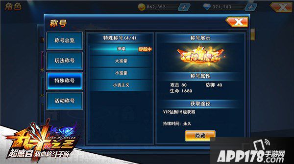 而其他的三个称号分别为“小富豪”,“大富豪”,“神壕”,获取途径也简单暴力,分别为VIP到达5、10、15级既可获得,属性强力,永久有效哦。