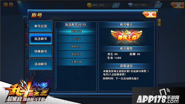 在《乱斗之王》里,称号一共分为三种,分别为玩法称号,特殊称号,活动称号。