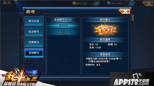 目前的活动称号只有两个,分别为“乱斗之王”和“乱斗达人”。前者象征着游戏内的最高荣耀,堪称稀有,其获得途径为,开服战力排行活动中第一名的玩家,这个称号是具有永久唯一性,可见其珍贵。而”乱斗达人“则是排名为2-4名的玩家,持续时间同样是永久性,亦是不可多得的珍品。