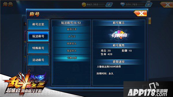 卡牌大师:是玩家人缘值达到300时即可获得,不过值得一说的是,这个称号是永久性的。