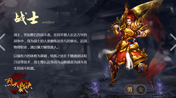 战士意志非凡,性格坚如磐石,强大的体格基础造就他们精湛的剑术和刀法。使用物理攻击的他们,善于近战,攻势摧枯拉朽,如同一部战斗机器。