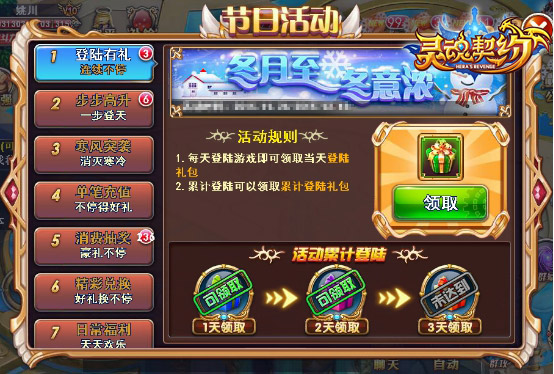 玩家在活动期间每天登陆都可领取一个礼包奖励,礼包内含大量节日活动道具,免费相送不求回报。同时活动期间每累积任意消费500蓝钻(交易、市场除外),即可获得一次抽奖机会,可重复消费获得机会,欢乐大奖抽不停!