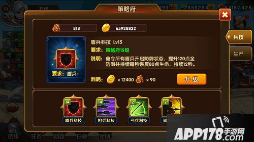 策略府是升级科技的地方,玩家可以在这里升级各种小兵技能,让小兵在战斗中发挥更大作用!