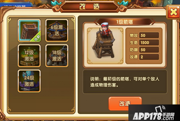 点击防御建筑就可以选择升级了,箭塔还可以进行改造,改造会有等级限制,望主公自己探索了