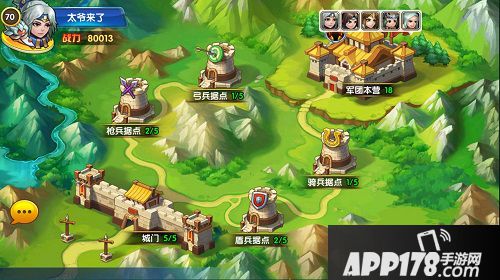 城池里一共分为6个建筑,包括:城门,盾兵据点,枪兵据点,骑兵据点,弓兵据点,军团本营。
