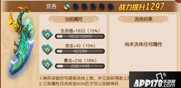 每种神兵的基础属性值都不同,可以通过洗炼对基础属性值进行提升。
