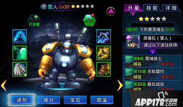 英雄升星同样是提升英雄品质的强有力手段,星级提升还会解锁英雄的技能(1星拥有一个技能,2星两个技能,三星三个技能)。虽然英雄的初始星级各不相同,但是只要使用一定数量的该英雄灵魂石,就可使其升星。如下图所示,英雄升星所需灵魂石凑齐后,点击右下角升星即可。