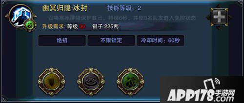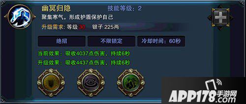 聚集寒气,形成护盾保护自己。吸收XXXX点伤害,持续6秒。吸收伤害数值会随着技能等级的提升而提升。冷却时间为60秒。总的来说算得上较为实用的保命BUFF技能,至少能够短时间保护住自己的生命。