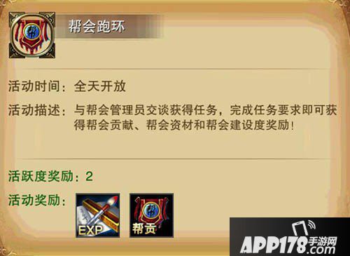帮会跑环是全天开放的活动任务之一,这个任务由有五环组成。(啊~五环~你比四环多一环~)每完成一个任务诸位玩家们便可以获得两点的活跃度,积累一定的活跃度可以在活动面板当中兑换奖励。