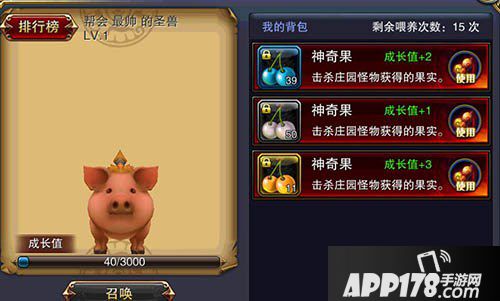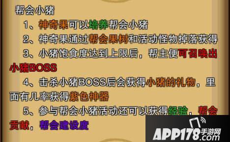 使用神奇果便可以喂养小猪,神奇果能够通过帮会果树和活动怪物掉落获得。小猪饱食度达到上限之后帮助便可以召唤出小猪BOSS,帮会玩家们齐心协力击杀小猪BOSS之后便可以获得小猪的礼物,小猪的礼物有几率获得紫色神器,参与帮会小猪活动的诸位玩家们还可以获得大量的经验,帮会贡献度,以及帮会建设度。