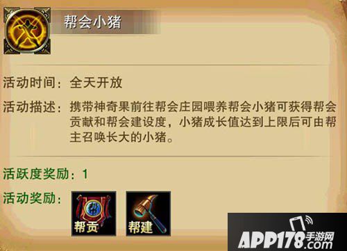 帮会小猪是全天开放的活动任务之一,携带着神奇果实的玩家们可以前往帮会庄园喂养小猪获得帮会贡献和帮会经验度,小猪成长值到达上线之后能够由帮助召唤长大的小猪。