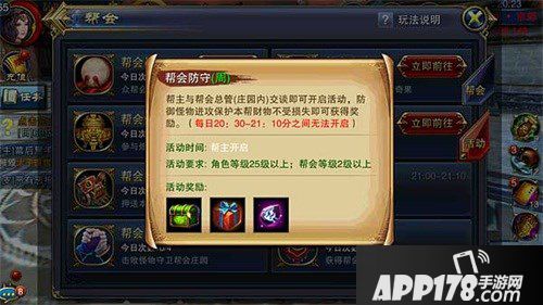 活动内容:帮主与帮会庄园内的帮会总管交谈后即可开启帮会防守(周)活动。活动开启后,满足条件的玩家防御怪物进攻,保护本帮财务不受损失即可获得奖励。