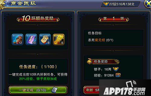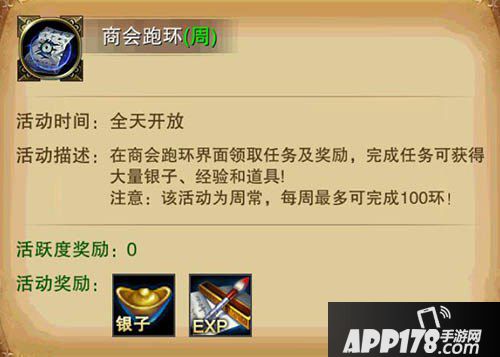 商会跑环任务不限制玩家们何时领取,何时结束,属于全天开放的活动任务之一。诸位玩家们能够在商会跑环界面直接领取任务以及奖励,完成任务便可以获得大量的银子,经验值,以及道具。这个任务属于周常任务,每周最多可以完成100环。虽然属于活动任务但是这个任务并不能够为诸位玩家们活跃度奖励。