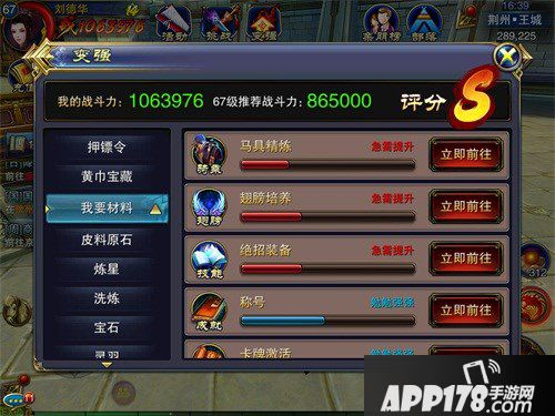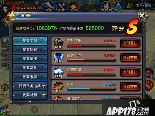 变强系统就在游戏的主界面,玩家们几乎不用多花精力技能找到,既然放在这么醒目的位置,肯定系统的作用还是不小的。进入系统后,我们就可以看到自己的战力以及当前等级对应的及格战力了。如果比推荐战斗力高,评分就是S;相反,如果比推荐战斗力低,系统就会根据相差的战力给予A、B、C等评级。