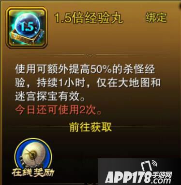 在这里建议诸位玩家们每天记得领取在线福利当中的1.5倍经验丸。1.5倍经验丸可以额外提高50%的杀怪经验,持续一个小时,仅能在大地图与迷宫探宝当中有效。大图当中怪物的经验相信诸位玩家们都懂得,那么经验丸要使用在那里自然也就不言而喻了。