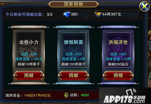获得功勋最简单的方法就是每天三次的国家捐献,出些小力能够每次能够获得100点功勋,感慨解囊每次能够获得200点功勋,选择用钻石进行洪福济世捐献的话能够直接获得500点功勋。