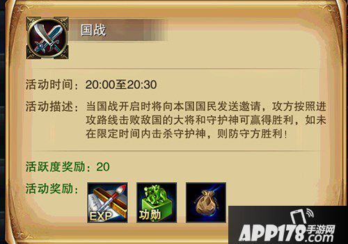 除了每天三次的捐献能够获得功勋以外,完成每日任务当中的九龙鼎,刺探军情、边境军需、镖镖必达、火烧敌营、无间道、国战、国探、国运等等有关于国家的任务也是可以获得数量不等的功勋点奖励。虽然是国家任务但有了免战牌的存在这些任务还是可以十分轻松的完成的。请诸位玩家们每天千万不要错过哦,详细内容可以通过主界面上面的活动面板进入查看。