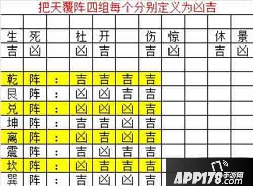 首先想要破阵,选门非常重要,玩家要选择凶门与吉门(挂红布的为吉门,不挂的为凶门),来激活BUFF。玩家一共要选择四次,不同的搭配会有不同的阵型BUFF,天覆阵各阵型如下: