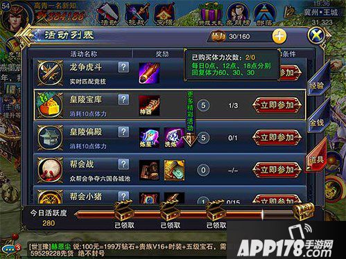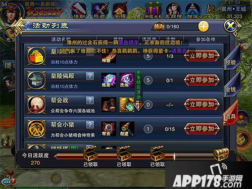 每天比较常规要做的需要体力的活动是藏金窟,消耗10体力,是获得金钱较多的活动,建议这个是要做的。长板桥,20体力,不用说,一定要每天必做的。
