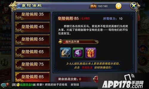皇陵偏殿与皇陵密室相同,是多人副本中的一个,可以获得大量的强化材料。皇陵偏殿共分7个等级,分别在25、35、45、55、65、75、85级解锁,等级难度越高,获得的降临越高。皇陵偏殿每天只有一次的挑战机会。