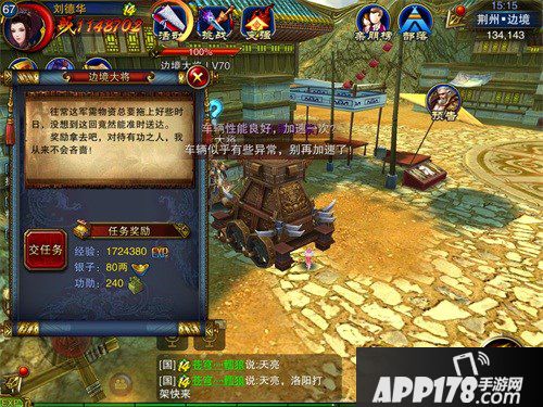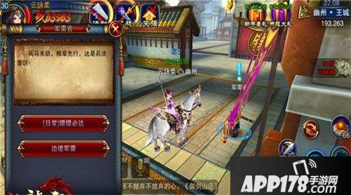 俗话说得好:兵马未动粮草先行。今天我们要驾驶的就是一辆满载军需物品的车,正因为如此,任务给出的奖励非常丰富(游戏中奖励功勋的任务非常少,这任务算是是玩家们获取功勋的必做任务之一)。玩家们准备好之后可以到王城(186.263)处找NPC——军需官。