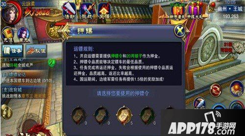 之后玩家们会出示自己的押镖符,押镖符分“白、蓝、黄、绿、紫”五种品质,不同品质的车奖励不同。玩家们可以使用低等级的押镖符来合成高等级的押镖符,比例是5:1。选择好自己的镖车之后,就跟随小编一起上路吧,一路上可不会太平哦。