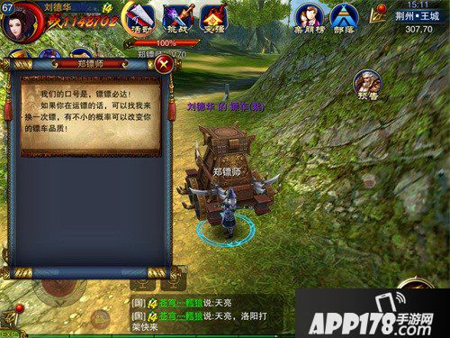 在押镖的途中我们会遇到路边的镖师,镖师的作用就是帮我们维修好镖车和将镖车升级。小编使用的是最高级的镖车所以在对话的时候并没有显示升级选项,在驾驶其他品质的镖车时是可以将镖车升级成高等级镖车的,当然这要看玩家们的运气了。所以,就算你只有白色品质的押镖符也不要担心,一路上多遇几个镖师说不定到达终点直线就变成紫色镖车了。