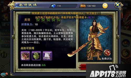 名将试炼玩家获取卡牌的一种途径,玩家击杀通过刷新出来的人物,获得该人物的卡牌,卡牌品质是随机刷新的,紫色卡牌获得几率还是很高的,玩家每天有3次免费刷新机会,每天有5次挑战机会,每次挑战消耗10点体力。名将试炼不仅能获得卡牌,还能获得经验以及龙符、虎符。