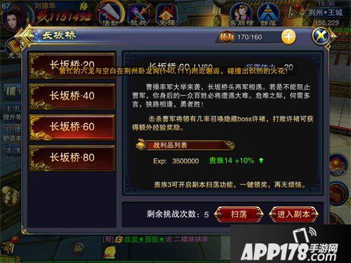 第二个快速升级的诀窍就是日常副本——长坂坡。玩家们可不要小看这个副本带来的收益哟,以60级长坂坡为例,一次扫荡就可以获得350万经验,贵族和QQ会员可以加成奖励。这里我们可以用150钻石购买5张扫荡券,一件扫荡获取高额经验奖励。