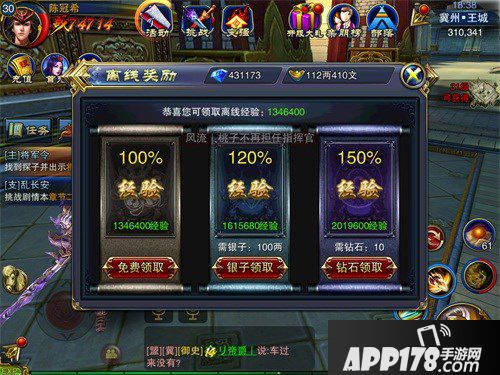 首先,是玩家们每天的离线经验,免费领取可以得到100%的经验,花费银子领取可以获得120%经验,花费钻石可以领取150%经验。如果你是VIP,还有额外的经验加成。