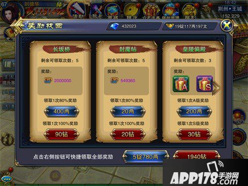 第三个领取经验的地方就是游戏中的找回系统了。不过这个系统的价格略贵,用钻石找回可获得100%的奖励,如果用银两领取就只能领取80%的奖励了,当然这里就要看各位玩家的经济实力了。但找回系统的奖励的确非常诱人啊,很多稀有的道具及各种声望功勋都可以获得。