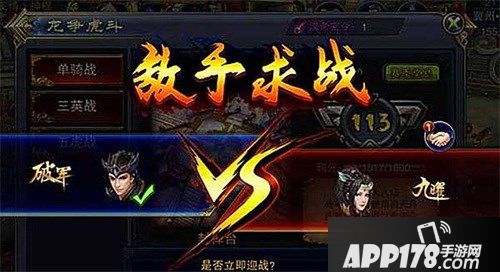 在参赛时间内,我们就能在龙争虎斗界面参加单骑战的挑战。点击主界面中的【准备迎战】按钮,系统会自动匹配积分相近的对手,并显示“敌手求战”信息,你可以看到对手的职业信息,如果选择迎战,点击“是”即可开战。