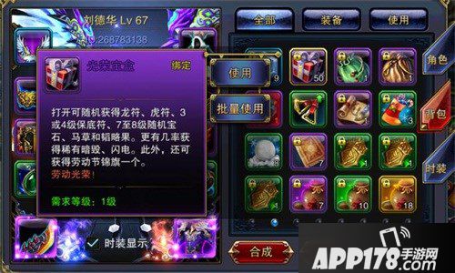 光荣礼盒原价388交易钻石,限时特价只需要88交易钻石。光荣礼包打开可随机获得龙符、虎符、3或4级保底符、7至8级随机宝石、马草和韬略果。更有几率获得稀有的暗断、闪电。此外,还可获得劳动节锦旗一个。玩家们可不要之看到坐骑和神羽,这些的掉落率都是非常低的,礼盒中的其他道具也是非常有用的。例如保底符和高级宝石,都是提升战力的关键性道具。