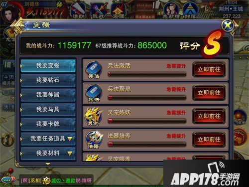 如果战力未达标,玩家们也不要担心,因为系统已经总结出了我们的不足之处。系统右侧会列出我们当前还做得不好的地方。从图中就可以看出,虽然评分已经是S,但是兵法激活、兵法聚灵、灵宠炼妖和法器培养等方面仍然做得不好。做得不好的地方当然就要第一时间弥补咯,点击“立即前往”按钮,系统就会自动代理进入对应的界面。这样,玩家们就再也不用担心不知道自己的不足处,真正做到亡羊补牢。