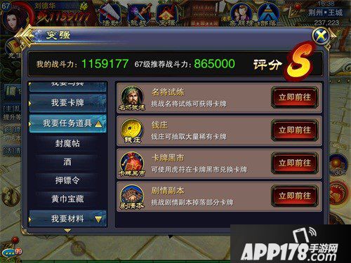 除了战力分析外,系统还为玩家们列举出了个中道具或资源的获取方式。系统左侧有很多功能性选项,几乎包含了游戏中所有的重要资源。例如:如果玩家们想要提升自己的坐骑装备,就可以点击“我要马具”;想要收集卡牌,就可以点击“我要卡牌”。不得不说,系统中的分类非常详细,上至体力道具,下至钻石神器,都可以在系统中找到对应的位置,而玩家们只需要点一起“立即前往”就可以了。