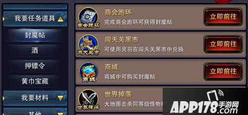 除了查询自身实力以及所需提升的不足之处意外,玩家们还可以在变强界面当中查询每日任务所需的道具,例如封魔贴啦,押镖令啦,以及黄金宝藏之类的。而玩家们也只需点击右侧的立即前往便可以直接到达获取任务道具的位置,是不是相当的便利呢?