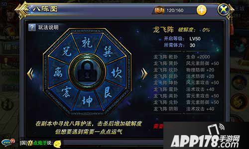 八阵中的第五个阵,与前四个阵相同,50级解锁,消耗30点体力,每天不限制挑战次数,玩家共需要通过4道门,挑战最后的BOSS才可破阵。每个政法有8个护法,玩家需要寻找并击杀护法才可以增加阵法的破解度,破解八阵图可以获得永久的属性加成。