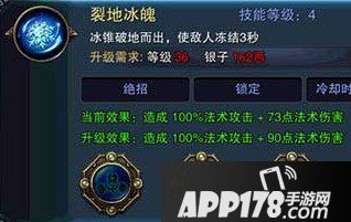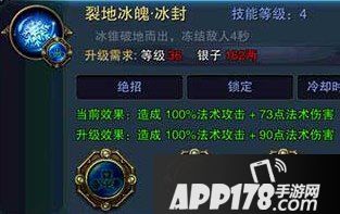冰锥破地而出,使敌人冻结三秒。造成100%法术攻击+XX点法术伤害,额外附加伤害随着技能等级的提升而提升。冷却时间为30秒。施放技能时需要锁定施法目标。是手游六龙争霸当中非常少有的群体性控制技能。