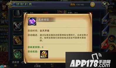 既然是70级的玩法,肯定很多同学都不知道乱世秘宝怎么做,下面就来科普下吧!乱世秘宝主要就是合成藏宝图,然后到藏宝图的位置挖宝,挖出什么完全是看人品了。藏宝图需要用藏宝图碎片合成,而碎片需要在仙境采摘获得。