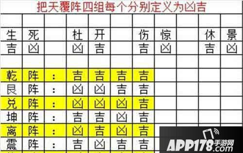 玩家进入坤阵,根据以上天覆阵的过关攻略,我们进门的顺序应该是吉,吉,凶,吉