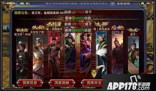 每个国家都有皇帝、皇后、大将军、太师、丞相、太尉、金吾卫和御史共8大官职,每日18:00帮会排行榜第一帮会的帮助将成为国王。每个官职的职能是有所不同的,其中作为国家的皇帝,可以自行任命所有官员,可以发动国战,并在国战期间可以使用指挥功能。