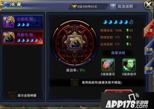 在获得满意的神器后,还可以将神器进行炼星来增加战斗力。神器炼星需要消耗炼星石,炼星石可以通过很多活动获得。炼星等级高了的神器才是真正的神器,可以为角色带来大量的属性和战斗力。