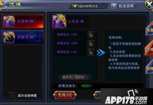 神器除了炼星之外,还可以进行洗炼,每个神器都会附加一条至五条的属性。附加的属性可以通过洗练来随机获得。洗炼出满意的属性后可以进行锁定,继续洗炼其他的属性。建议小伙伴们最好多多的洗出攻击的属性,这样的收益会比较高哦。