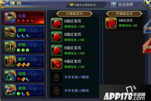 装备进阶成功一次就会多出一个宝石孔。不同的装备可以镶嵌的宝石不同,宝石可以在很多的活动中获得,比如说国战,神羽商店兑换,商城可以购买到高级的宝石。相同等级的宝石可以合成一颗高级的宝石,合成需要三个。镶嵌宝石可以获得大量的属性和战斗力是角色养成中非常重要的一个环节,小伙伴,可以通过自己的努力争取镶嵌高级的宝石,可以增加很多的战斗力。很多活动中都可以获得宝石,可以慢慢积攒。
