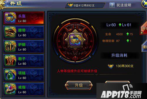 装备是战斗力提高的一个主要的表现,在六龙争霸3D的游戏世界中,装备都是固定的6件,分别是头盔,腰带,护腿,鞋子,项链和戒指。装备可以根据玩家的等级来进行升级提高属性。装备等级可以升级到跟玩家同一个等级。升级需要消耗银币。装备升级到一定程度后可以进阶,需要皮料和原石。副本皇陵密室是获得皮料和原石最好的地方,每天可以参加3次,可以组队完成。另外可以在强化钱庄中进行抽取。
