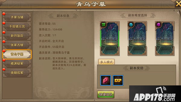 1、副本青乌子墓55级开启,可以获得坐骑升星材料朱砂古印以及经验