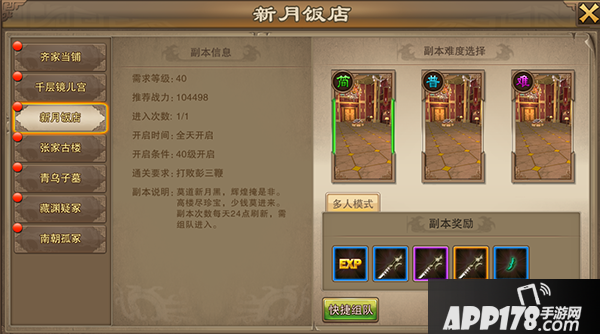 新月饭店40级开启,是游戏获得装备的主要途径之一,在这里可以获得大量的装备、青铜枝以及经验,青铜枝是强化装备的必需品。