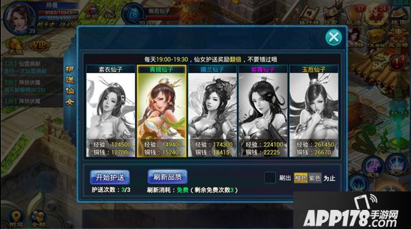 玩家可以在主城护送仙女NPC领取护送仙女任务,领取任务前可使用仙女石道具刷新仙女等级;(每天前3次刷新免费)