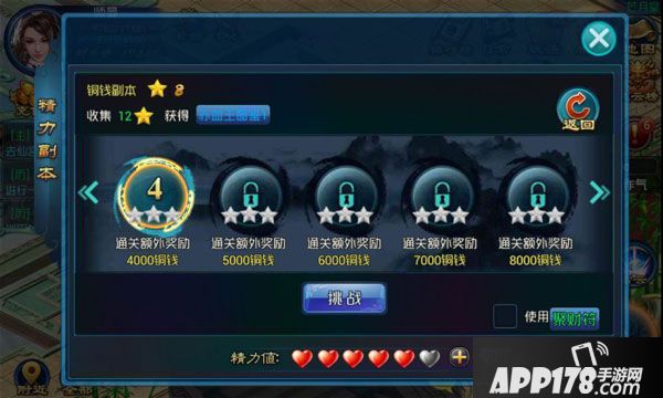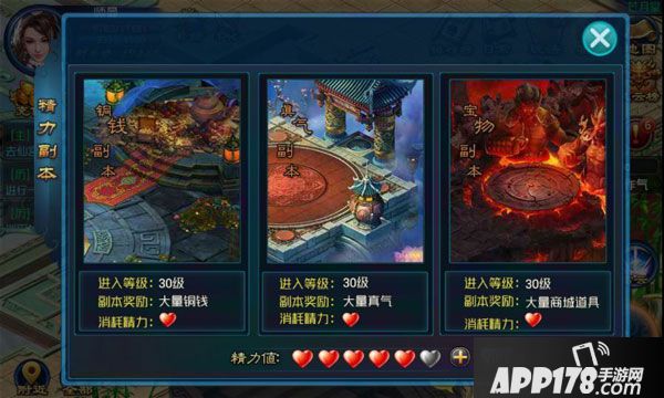 1.精力副本分为铜钱副本,真气副本和宝物副本三个类型: